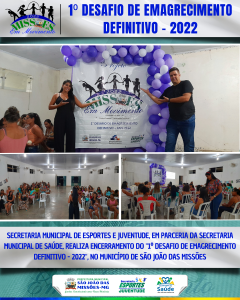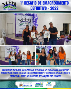 Para auxiliar na perda de peso e principalmente, na busca por uma vida mais saudável, a Secretaria Municipal de Esportes e Juventude, em parceria da Secretaria Municipal de Saúde, através do NASF – Núcleo de Apoio Familiar, lançou o “1⁰ Desafio de Emagrecimento Definitivo” do projeto Missões em Movimento para mulheres da cidade de S. J. das Missões e de comunidades missionenses. Cerca de 200 mulheres missionenses de todas faixas etárias participaram, durante 60 dias, do desafio que ofertou atividades físicas, alimentação balanceada sob orientação de nutricionista, apoio psicológico e palestras pelos profissionais do Esportes e da Saúde de São João das Missões.